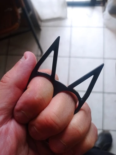 Grip the cat ear keychain through the finger holes and feel the power of this sharp potent self-defense tool. Armed with two large pointy spikes that resemble cat ears, this feline keychain may look cute and dainty, but it can help you fight off an attacker and collect their DNA.